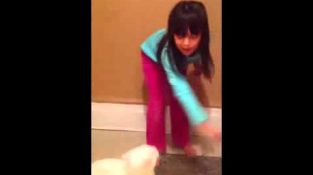 A little girl hits a cat playing, but the cat will attack apparently vexed.