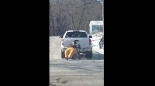 In Kansas City in the United States, one motorist logs a pick-up truck pulls with rope an obese woman sitting in an electric cart.