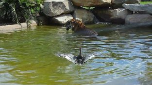 A duck trolarei a tiger in a Lake Wildlife Park Symbio, in Helensburgh Australia. The duck enjoys the bath of the water surface, while the tiger tries to catch. Though […]