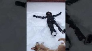 Charlene and Brewer making snow angels, and dog-angels!