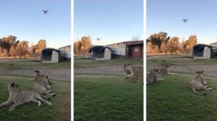 These adorable lion cubs show their true hunting instinct as they react to a drone being flown over their camp.