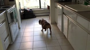 For some strange reason, the Bentley Bulldog reverse when he wants to get out of the kitchen.