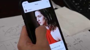 A man zooms in on a colleague’s picture while browsing on his smartphone …