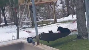 In the yard of a house in Connecticut United States, three young bears trying to lie on a hammock without success.