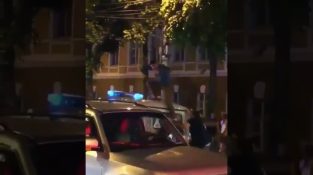 English fan jumps on a Russian patrol car