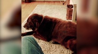 A dog found in the house living room leaves a fart. Then the cat sick and vomit on the carpet. A funny scene created with two different video editing.