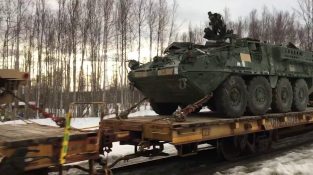 A train in Alaska Station carries about 130 military vehicles, most of which were armored personnel Stryker vehicles.