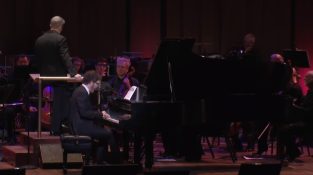 The musician Ben Folds live composes a piece for symphony orchestra during the concert Sound Health in Concert: Music and the Mind at the Kennedy Center in Washington.
