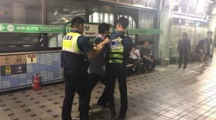 A drunk man in subway station in Seoul, Korea shows aggressive, but attending one knows how to calm him.