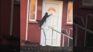 A cat returns home owner and knocks on the door waiting for someone to open the.