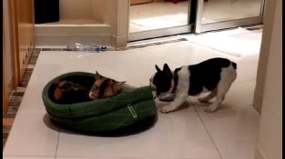 A small French bulldog trying to clear the cat is lying back on his bed.