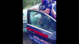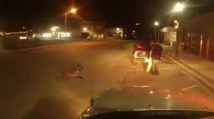 A police dog saves his colleague when a suspect is attempting to attack. On the alert, dog rushing with impressive speed and stopping the villain.