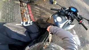 A motorcyclist record his first motorcycle accident. A moment of inattention led to conflict. Fortunately wore helmet.