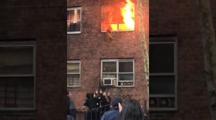 A cat inside a burning building in Haarlem, United States, jumps into the hands of police officers.