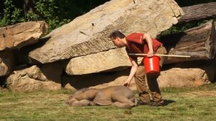 At the Prague Zoo in the Czech Republic, a little elephant slept so soundly, that his mother was anxious and the caretakers had to intervene.