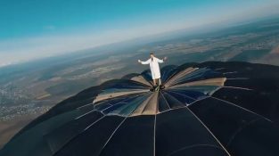 In Ukraine, Wingsuit and base jump coach Aleksandr Marushko (@marushko), stands in a hot air balloon to drink his coffee.