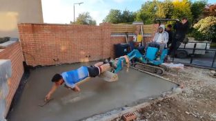 A man aligns fresh cement as he lies on two sticks mounted on an excavator.