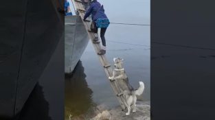 A husky wants to follow his boss on a boat. Eventually he will manage to climb the wooden ladder.