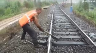 The precision with which a railway worker nails the new rails to the sleepers (traverses).