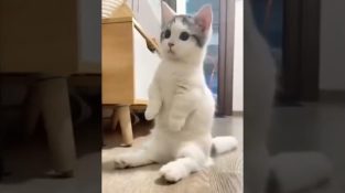 A kitten plays like a dog. She stands on both feet waiting for her owner to throw her an object, to bring it back.