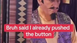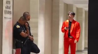 A man dances to Michael Jackson while passing police officers in the lobby of a building.