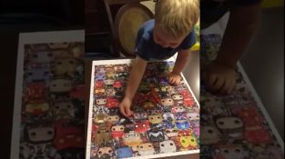 A little boy places the last piece in a large puzzle on a table, but then he slips and falls down, dragging the entire puzzle with him to the floor.