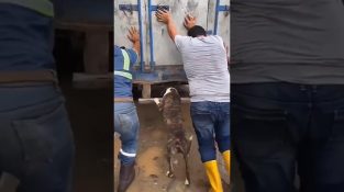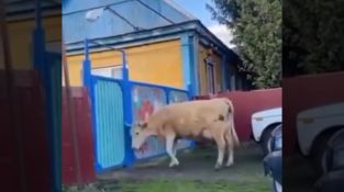 A cow that has learned to open a door with its horns, returns after the ride to its owner.