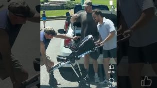 Three men struggle to fold a collapsible baby carriage. Will they succeed;