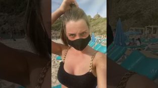 A woman who spent a lot of time on the beach with her mask, finds that he did an uneven tan.
