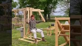 A man shows us the gym equipment he has made himself, to work out in the countryside.