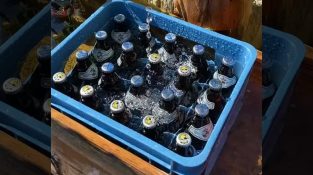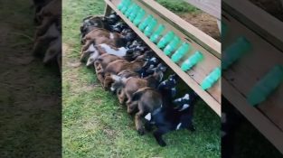 On a farm, twelve little goats drink their milk at the same time through a special feeder made by a breeder.