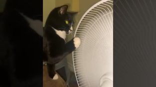 A cat has fun putting its foot on the wings of a fan. According to its owner, he does it constantly.