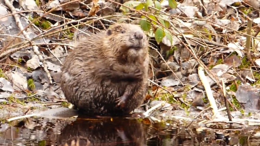 Un castor de pie en el borde de un lago y se lava a fondo su pelaje.