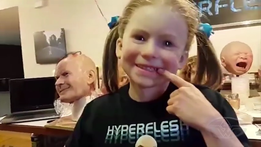 El artista Landon Meier, también conocido como Hyperflesh, se especializa en la fabricación de máscaras muy realistas. Aquí nos muestra una de las máscaras horripilantes, uno con la cara de una niña.