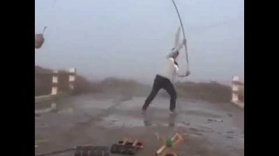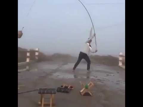 Un hombre de Japón para hacer pruebas de resistencia extrema en dos cañas de pesca. El pescador Samurai.