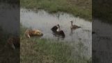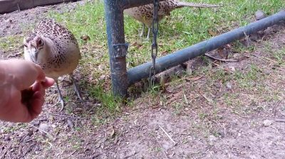 Un hombre de alimentación faisanes cuando el rey parece ser un poco picado por la comida. Se trata de un faisán dorado maravilloso con alas de oro.