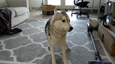 Una ronca entusiasta reacciona muy divertido cuando quiere jugar con su jefe.
