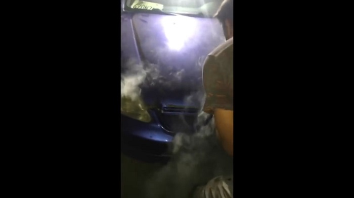 Tres divertido joven que finge conducir un viejo Honda Civic.