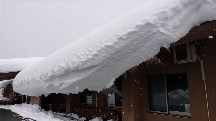 El uso de un palo largo, Un hombre limpia la enorme cantidad de nieve acumulada en el techo de un hotel.