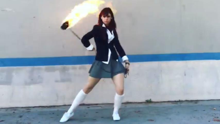 El acróbata con el sobrenombre flujo Mayhem de Los Ángeles, hace un baile espectacular con una bola de fuego, inspirado en el personaje Gogo Yubari de la película “Kill Bill”.