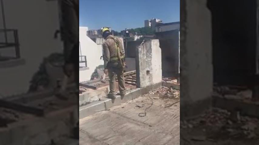 Un trabajador trata de demoler una pared con un martillo, sin gran éxito. Un colega vendrá a mostrar el camino.
