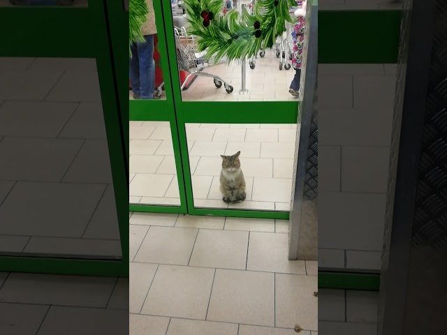 Un gato está esperando pacientemente delante de la puerta automática de una tienda.