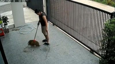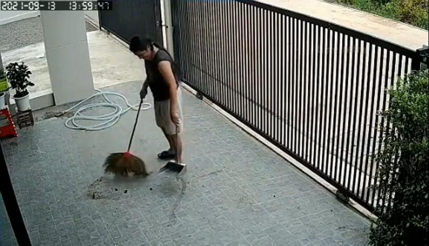 Mientras se limpia, un hombre pierde repentinamente su escoba, que acaba de poner bajo una mano.