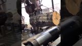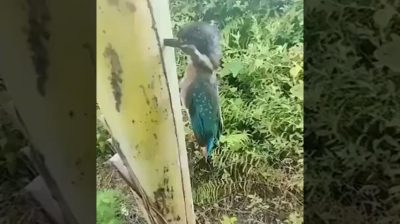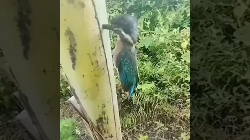 Un hombre acude en ayuda de un martín pescador clavado con el pico en el tronco de un plátano.