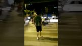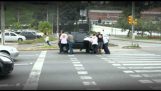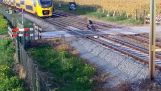 El conductor de un gran camión no logra cruzar a tiempo un paso a nivel, y el tren choca con su remolque. El conductor inicialmente parece estar tratando de abrocharse el cinturón de seguridad., pero él nunca la inmovilizó en la ranura.