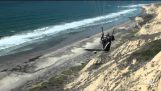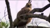 Un águila atrapa un cangrejo en su pico tratando de comérselo. Pero el cangrejo resistirá y escapará., escalando en la cabeza del águila.