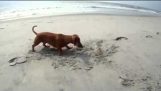 Un cachorro mueve un pequeño taburete para que a una abuela le resulte más fácil sentarse.