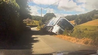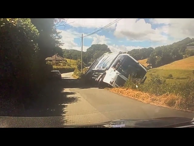 Un camión de basura vuelca en un campo y rueda varias veces al pasar autos en una carretera secundaria cerca de Welshpool, País de Gales. Los dos recolectores no resultaron heridos..