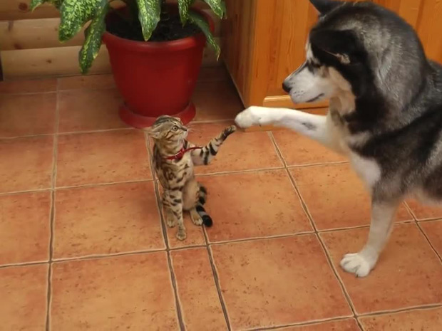 En la cocina de una casa en Rusia, un adorable Husky Siberiano se encuentra primero con un gato de Bengala. El perro quiere jugar con el gato, Pero parece inquieto y cuidado.