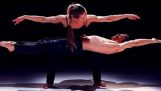 Una niña hacer algunas volteretas improbables y giros en el aire.